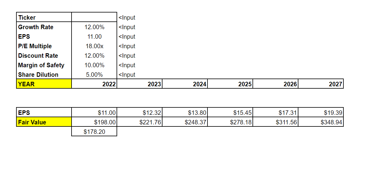 This spreedsheet allows you to estimate the intrinsic or true value of a stock. You must input estimated values for the boxes that ask for inputs. You can make accurate estimates by analyzing a companies fundementals. It is also helpful to make more conservitive estimates to assure success.