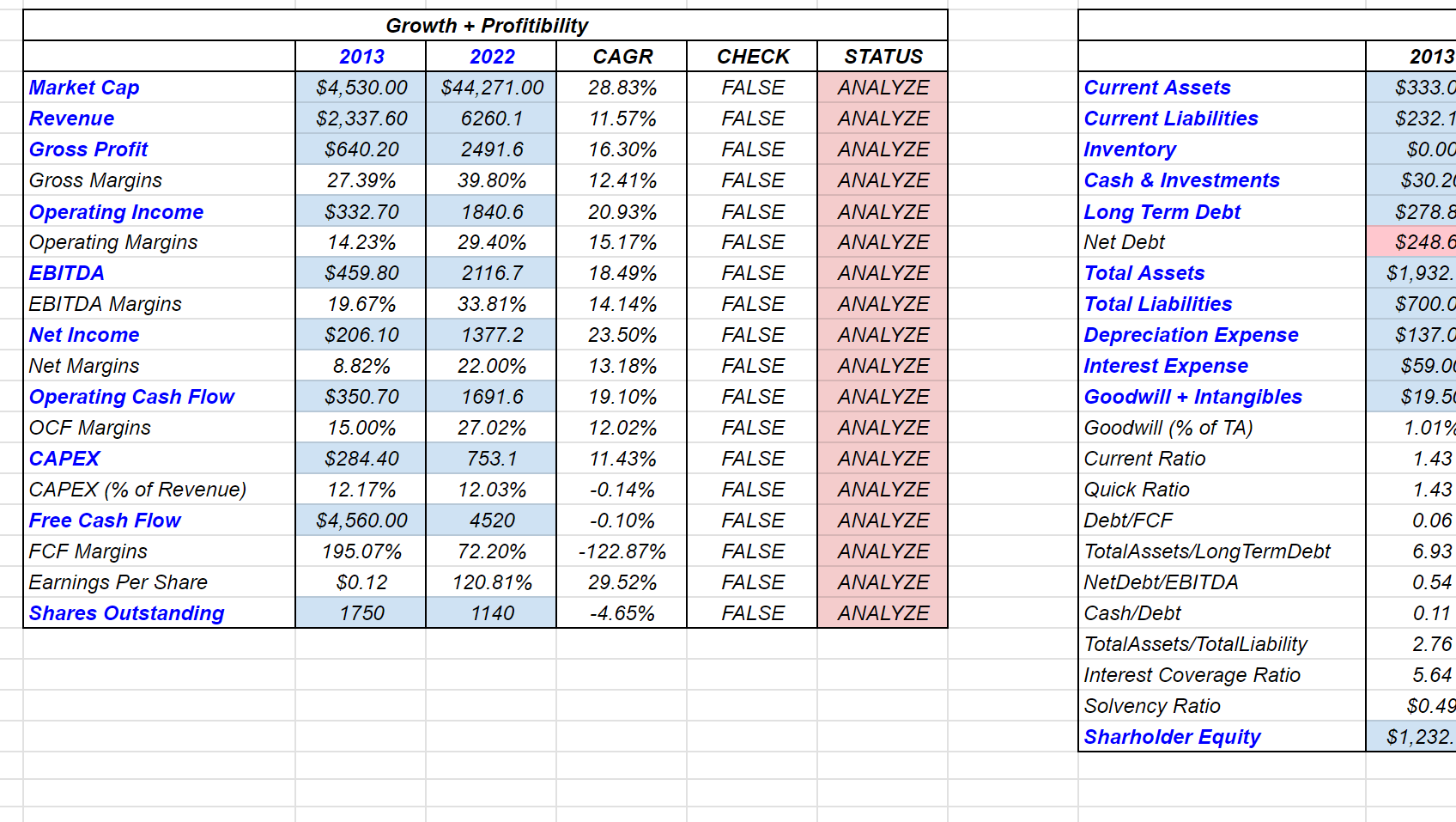 This spreadsheet displays all the key factors needed to fully analyze a company quantitatively. It goes over 5 categories: Growth, profitability, finanical health, efficency and valuation. Edit the boxes with a blue background. Note that you should still do qualitative analysis to fully understand a company.
